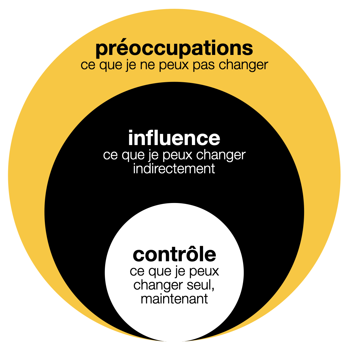 La prochaine fois qu'une situation vous fait grimper dans les rideaux, posez-vous cette question toute simple : « Est-ce que cette situation est dans mon cercle de contrôle / d’influence ou seulement dans mon cercle de préoccupations ? »